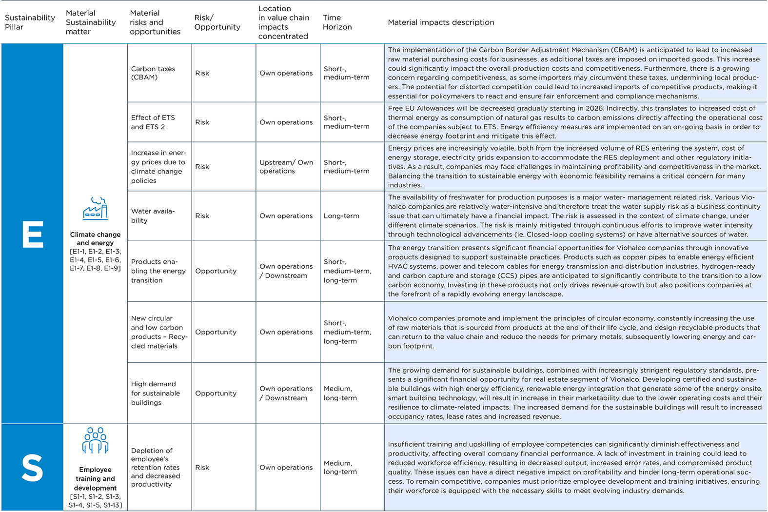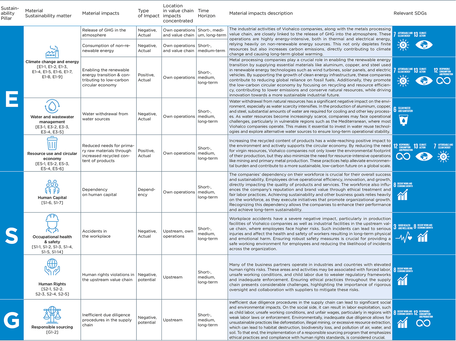 Viohalco recognizes that the double materiality assessment is an ongoing process, and that the results should go beyond reporting purposes. The results of the DMA and the insights from stakeholders will play a pivotal role in refining the existing Sustainability Strategy. The results of the DMA for the consolidation at Viohalco level are presented in the table below.