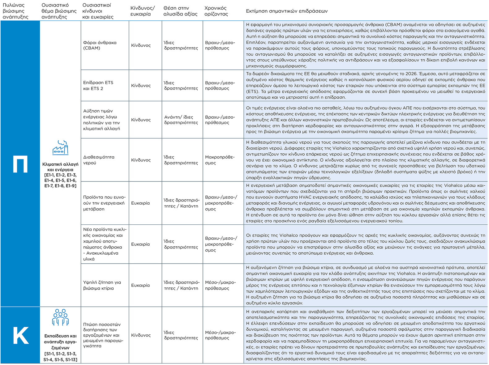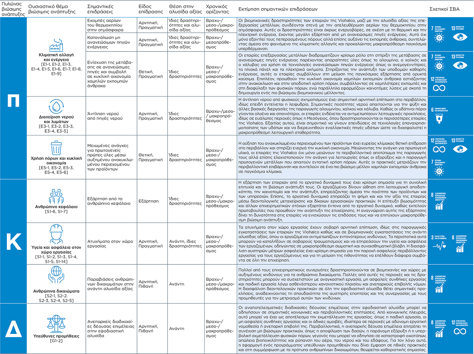 Η Viohalco αναγνωρίζει ότι η αξιολόγηση διπλής ουσιαστικότητας είναι μια συνεχής διαδικασία και ότι τα αποτελέσματα θα πρέπει να υπερβαίνουν τους σκοπούς υποβολής εκθέσεων. Τα αποτελέσματα της αξιολόγησης διπλής ουσιαστικότητας και τα στοιχεία από τα ενδιαφερόμενα μέρη θα διαδραματίσουν κομβικό ρόλο στην βελτίωση της υφιστάμενης στρατηγικής βιώσιμης ανάπτυξης. Τα αποτελέσματα της αξιολόγησης διπλής ουσιαστικότητας για την ενοποίηση σε επίπεδο Viohalco παρουσιάζονται στον ακόλουθο πίνακα.