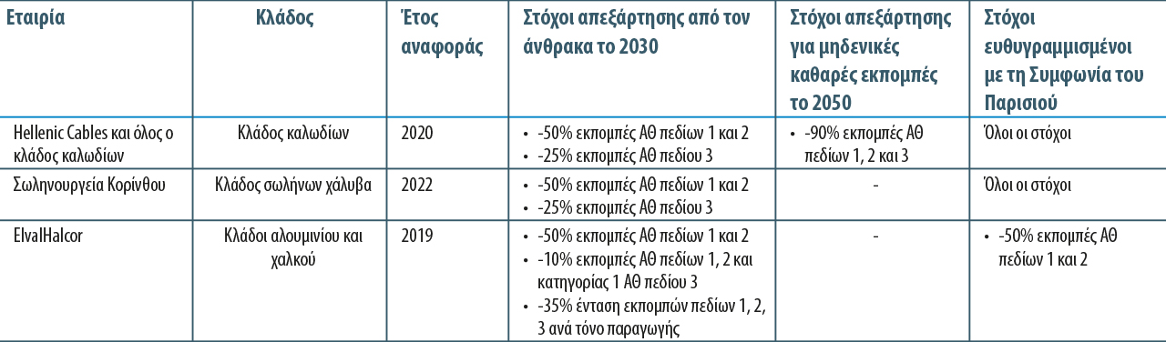 Στο πλαίσιο αυτών των δεσμεύσεων, οι θυγατρικές της Viohalco εξελίσσουν συνεχώς τα σχέδια, τις δράσεις και τους στόχους τους για να μειώσουν το αποτύπωμα άνθρακα που προκαλούν και να συμβάλουν στην παγκόσμια προσπάθεια για την αντιμετώπιση της κλιματικής αλλαγής. Τα σχέδια μετάβασης των θυγατρικών συνδέονται στενά με τη συνολική επιχειρηματική στρατηγική και τον οικονομικό προγραμματισμό, διασφαλίζοντας την ευθυγράμμιση με τους μακροπρόθεσμους στόχους βιώσιμης ανάπτυξης. Οι στόχοι απεξάρτησης από τον άνθρακα που έχουν θέσει οι θυγατρικές της Viohalco συνοψίζονται στον πίνακα: